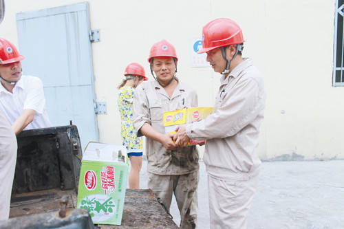 7月30日,室外氣溫38度,廣西新洋豐公司組織后勤人員到車間一線送清涼,為所有職工、勞務(wù)工及貨車司機發(fā)放冰凍綠茶。