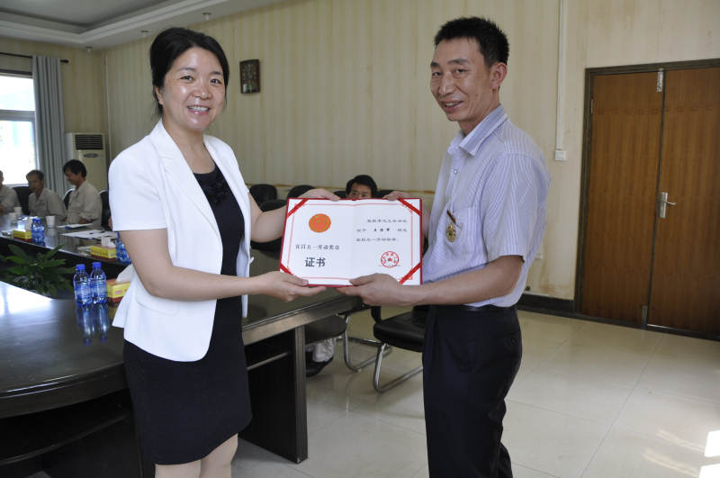 宜昌市總工會黨組成員、女工主任朱利民(左)為王宗軍頒發(fā)獎?wù)潞妥C書