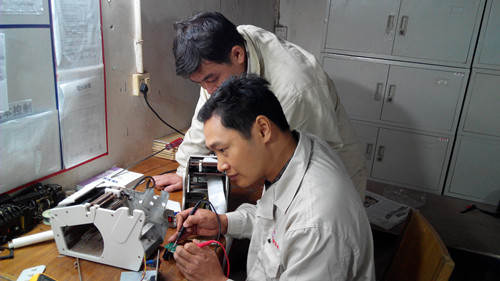 張金炎(前)正在檢修設(shè)備