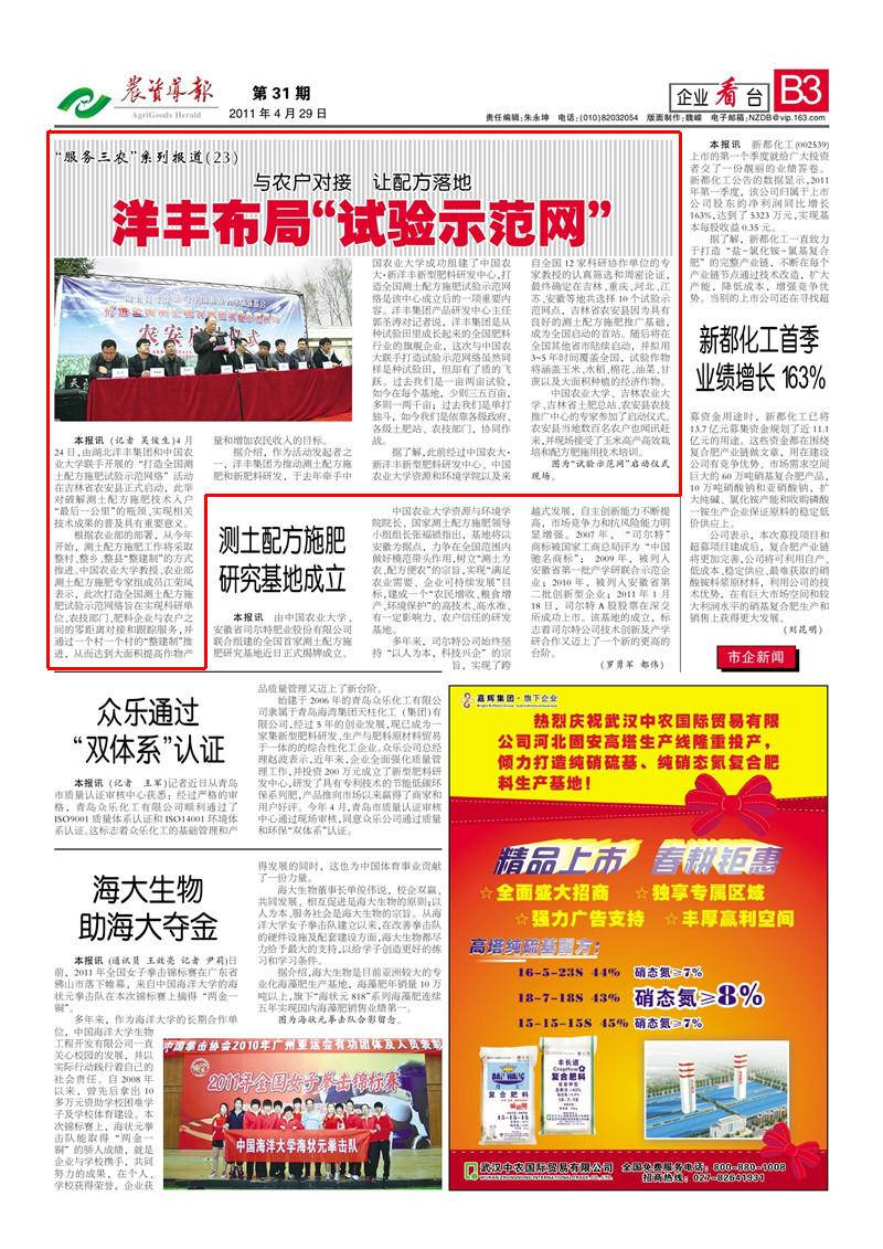 郭圣濤對記者說, 洋豐集團是從種試驗田里成長起來的全國肥料行業(yè)的旗艦企業(yè),這次與中國農(nóng)大聯(lián)手打造試驗示范網(wǎng)絡雖然同樣是種試驗田,但卻有了質(zhì)的飛躍。過去我們是一畝兩畝試驗,如今在每個基地,少則三五百畝,多則一兩千畝曰 過去我們是單打獨斗,如今我們是依靠各級政府、各級土肥站、農(nóng)技部門,協(xié)同作戰(zhàn)。