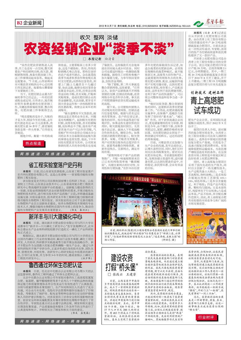 根據(jù)協(xié)議,湖北新洋豐肥業(yè)股份有限公司與四川大學(xué)將在關(guān)注國(guó)內(nèi)外磷化工行業(yè)的發(fā)展動(dòng)向、解決行業(yè)技術(shù)難題、磷化工項(xiàng)目研發(fā)、人員培訓(xùn)、科研教學(xué)實(shí)踐基地等方面開(kāi)展全面戰(zhàn)略合作。新洋豐肥業(yè)作為全國(guó)最大的復(fù)合肥和磷酸一銨生產(chǎn)企業(yè),通過(guò)與多家科研院所開(kāi)展產(chǎn)學(xué)研合作,正逐步形成自身的技術(shù)優(yōu)勢(shì)、團(tuán)隊(duì)優(yōu)勢(shì)、管理優(yōu)勢(shì)、市場(chǎng)優(yōu)勢(shì)。該研發(fā)中心將研發(fā)貼近市場(chǎng)需求的新產(chǎn)品,引導(dǎo)行業(yè)發(fā)展,并力爭(zhēng)用 3-5 年的時(shí)間,建成省級(jí)以上磷化工工程技術(shù)研發(fā)中心。