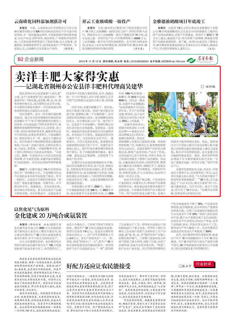 2002 年,吳建華通過114 向?qū)ЬW(wǎng)查詢到洋豐廠家的聯(lián)系方式,于是便跟當(dāng)時這個區(qū)域的業(yè)務(wù)員杜華東取得了聯(lián)系,雙方一拍即合,公安縣洋豐肥料代理商的“委任狀”便被吳建華接榜。吳建華說,洋豐肥品種齊全,質(zhì)量穩(wěn)定,不結(jié)塊易存放,相對湖北市場來說,更大的優(yōu)勢在于運輸方便易采購,而且價格適中。這就是他當(dāng)時選擇洋豐的最主要的原因。如今,他提出的一個口號“厚道人賣洋豐肥,聰明人買洋豐肥”已經(jīng)響徹公安縣的大街小巷、田間地頭。