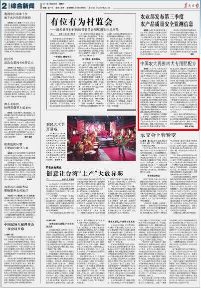 10月中旬,中國農(nóng)業(yè)大學資源與環(huán)境學院再次推出油菜、蔬菜、蘋果、大蒜等4大專用肥配方,并由湖北新洋豐肥業(yè)生產(chǎn)上市。這是繼今年9月,中國農(nóng)大資環(huán)學院設計6個小麥專用肥配方之后的又一重大突破。至此,中國農(nóng)大資環(huán)學院已經(jīng)成功設計出10個專用肥配方,完成了全國測土配方專用肥總體設計任務的1/3。