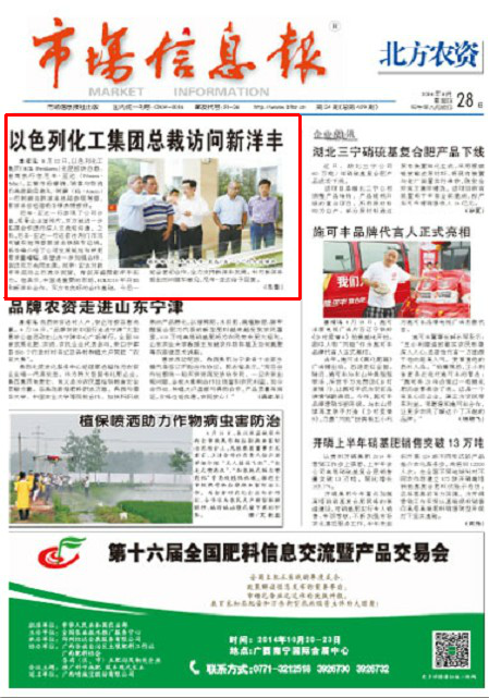 8月12日,以色列化工集團(tuán)(ICL Fertilizers)化肥板塊總裁、首席執(zhí)行官尼辛·亞達(dá)(Nissim·Adar),主管市場(chǎng)營(yíng)銷、銷售與物流的高級(jí)副總裁禮·阿蒙(Eli·Amon)一行到湖北新洋豐總部參觀考察,新洋豐總經(jīng)理?xiàng)钊A鋒熱情接待。