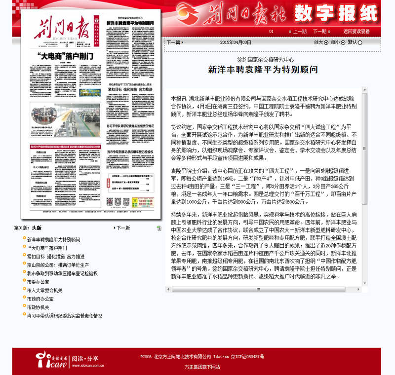 湖北新洋豐肥業(yè)股份有限公司與國家雜交水稻工程技術(shù)研究中心達(dá)成戰(zhàn)略合作協(xié)議,4月2日在海南三亞簽約,中國工程院院士袁隆平被聘為新洋豐肥業(yè)特別顧問,新洋豐肥業(yè)總經(jīng)理?xiàng)钊A鋒向袁隆平頒發(fā)了聘書。